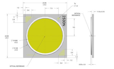 Размеры - 23,85*23,85 мм, диаметр люминофора внутренний - 19 мм, внешний по рамке 21 мм.